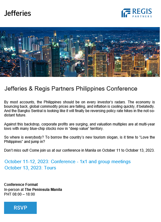 Closer to home, Regis Partners’ Philippines conference is the largest of its kind in the country. The annual Philippines Conference, on its 11th year in 2023, provides an exciting venue for investors and corporates to come together to discuss macro, industry, and corporate strategy through one-on-one, group meeting, and presentation formats. The conference also features keynote speeches by thought leaders, policy makers, and industry experts. Relevant field trips and site visits cap the three-day event. Regis Partners’ Philippines conference has attracted up to 200 foreign and local investors, as well as senior management of over 50 major listed companies in the Philippines Stock Exchange annually. The Jefferies & Regis Philippines Conference will be held on 11-13 October 2023.